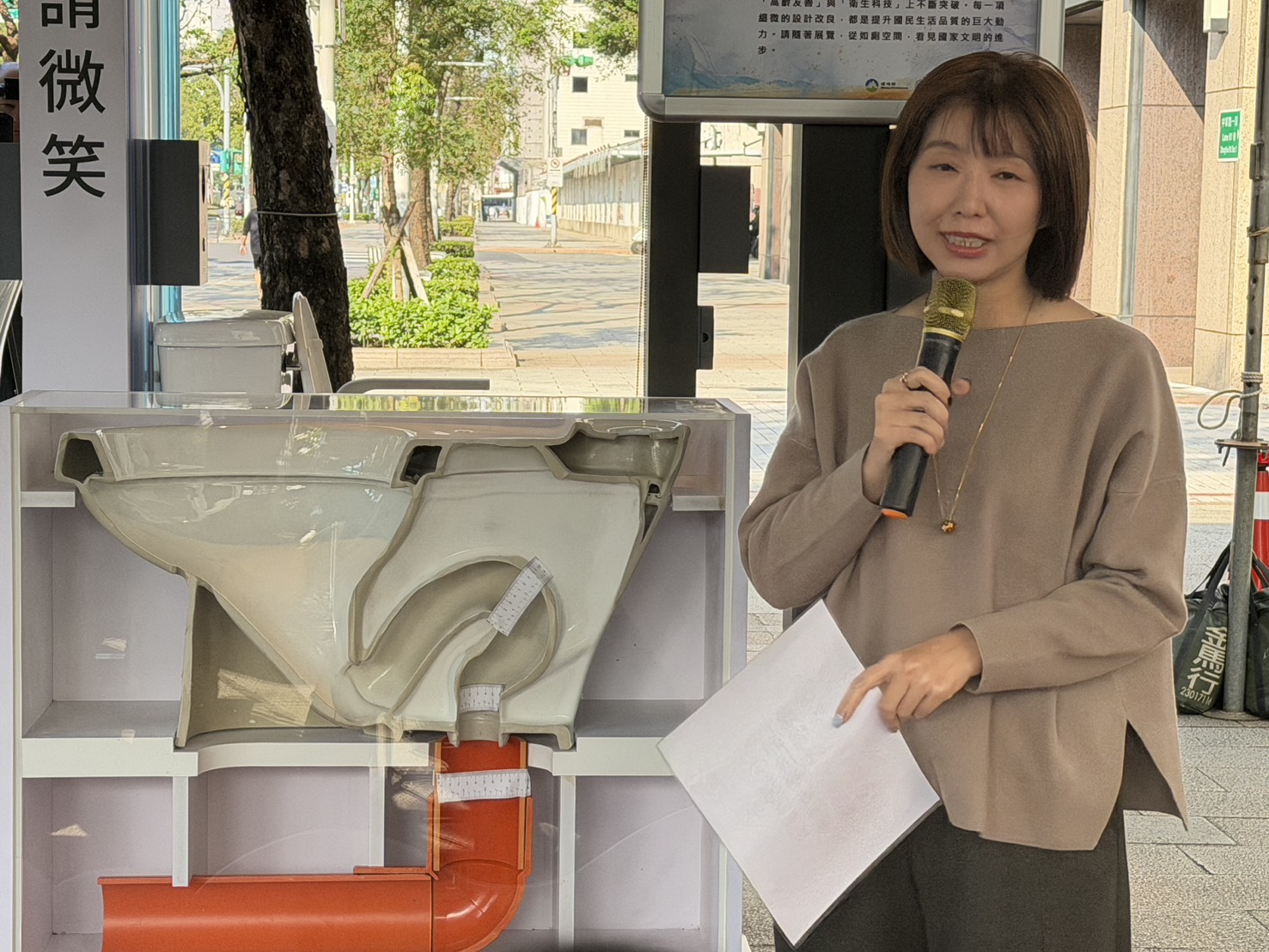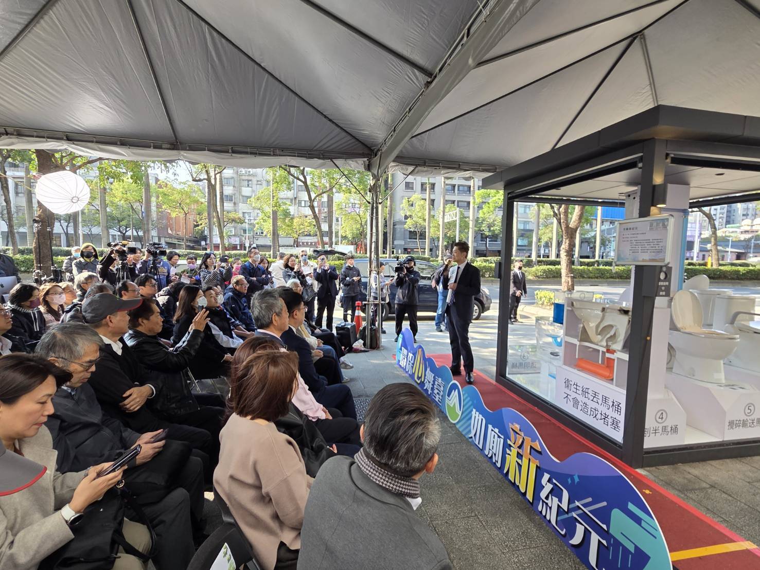 環境部彭啓明部長說明,乾淨、舒適且科技性的如廁環境,象徵著國家對公共衛生、環境保護以及人權尊嚴的重視,記者會也邀請了立法委員王育敏、吳沛憶、洪孟楷、郭昱晴、張雅琳及黃珊珊等6位委員蒞臨現場共襄盛舉,現場由大安森林公園之友基金會蔡建生常務董事介紹展示之六款不同機能的馬桶設備,除了展現在「節水環保」、「高齡友善」與「衛生科技」上不斷突破,也展示衛生紙為什麼可以丟馬桶的原因,每一項細微的設計改良及每一個人的行為改變,都是提升國民生活品質的重大進步。