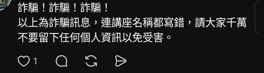 煩請大家協助澄清,避免無辜民眾受害。講座也能被拿來詐騙,真的是老天爺啊!