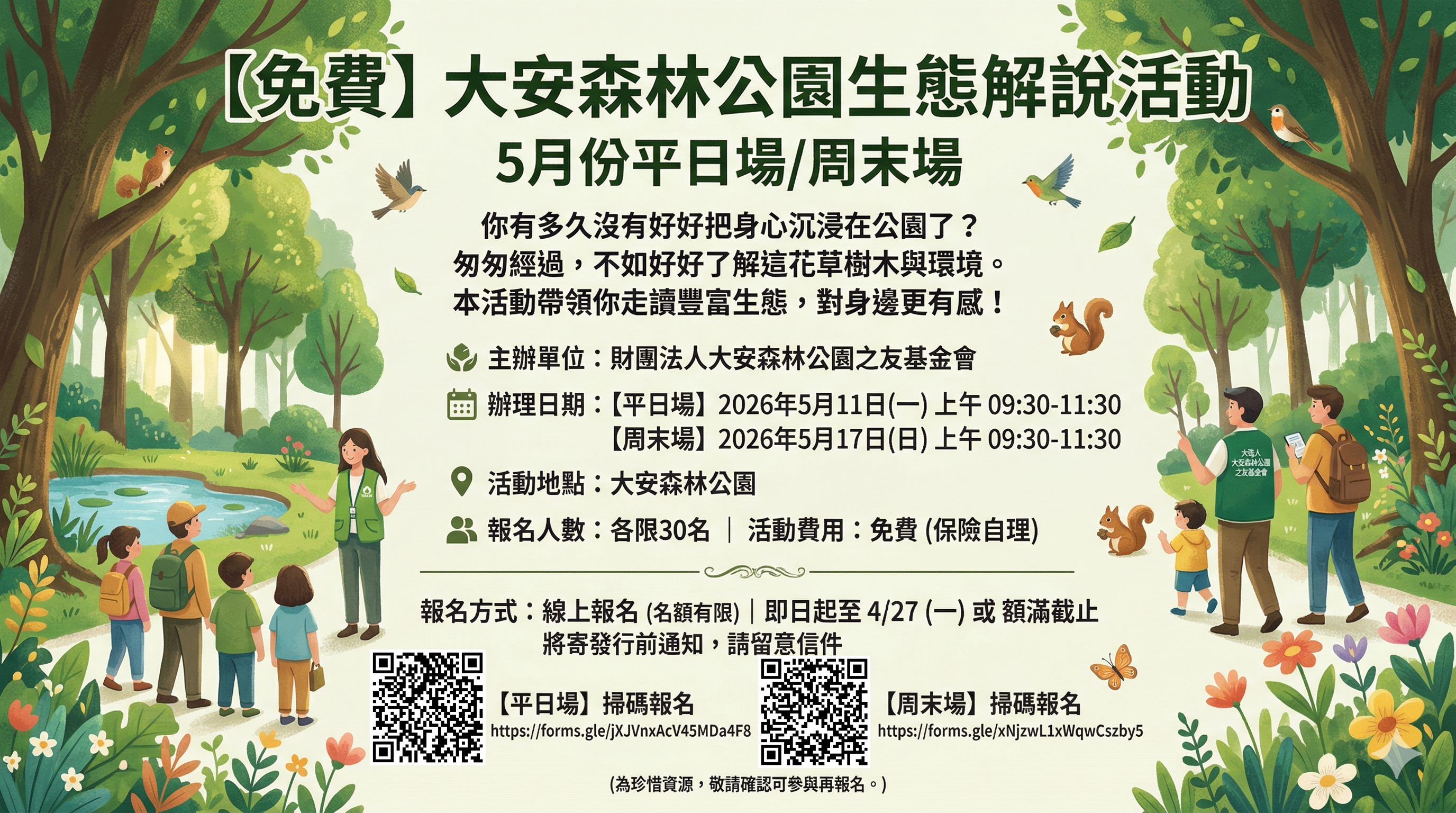 【免費】大安森林公園生態解說活動 5月份平日場/周末場