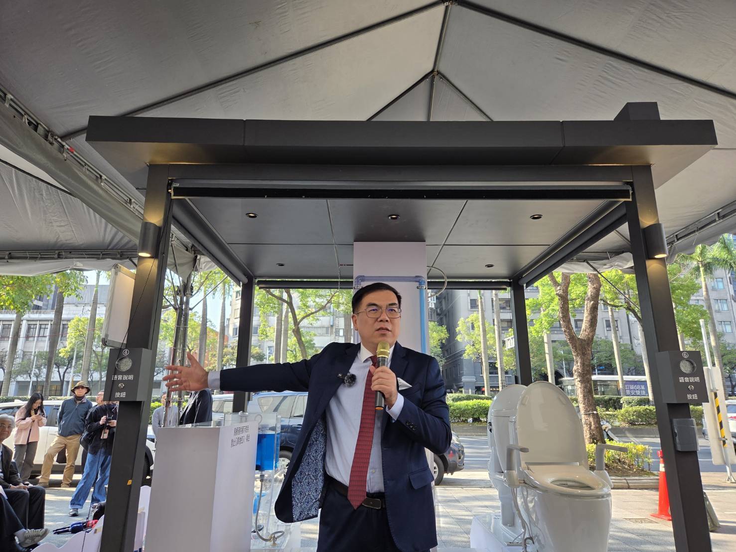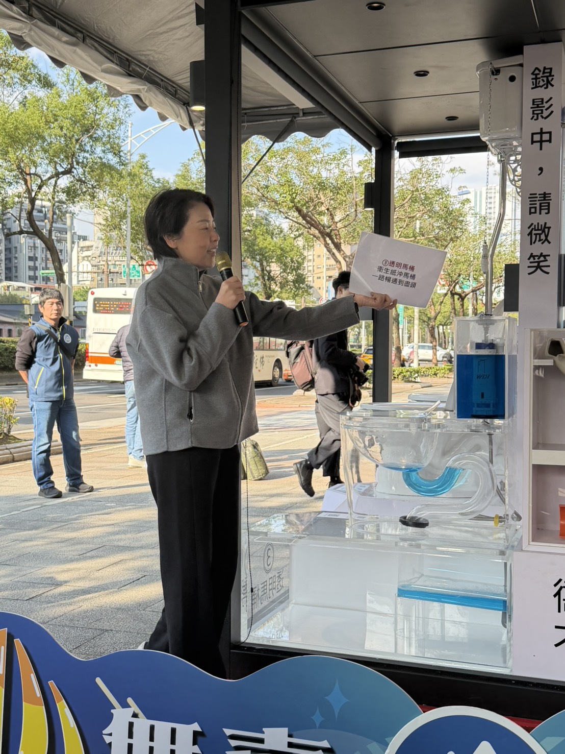 環境部彭啓明部長說明,乾淨、舒適且科技性的如廁環境,象徵著國家對公共衛生、環境保護以及人權尊嚴的重視,記者會也邀請了立法委員王育敏、吳沛憶、洪孟楷、郭昱晴、張雅琳及黃珊珊等6位委員蒞臨現場共襄盛舉,現場由大安森林公園之友基金會蔡建生常務董事介紹展示之六款不同機能的馬桶設備,除了展現在「節水環保」、「高齡友善」與「衛生科技」上不斷突破,也展示衛生紙為什麼可以丟馬桶的原因,每一項細微的設計改良及每一個人的行為改變,都是提升國民生活品質的重大進步。