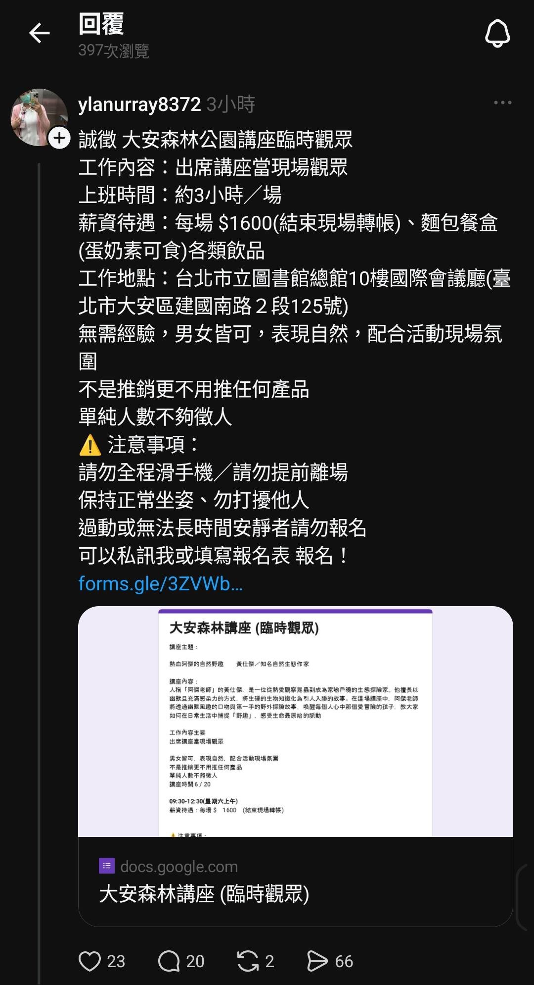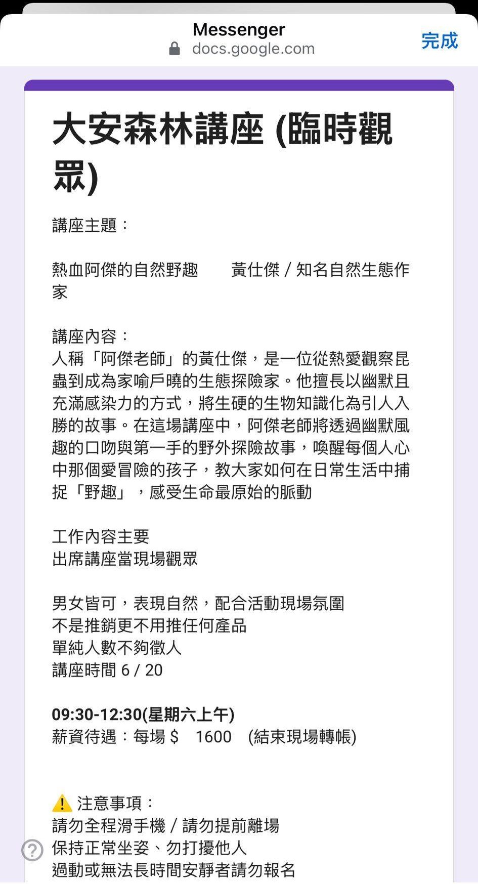 大安講座6月場次主講老師阿傑來電告知,有人以「大安森林講座」6月場次為名,召募「臨時觀眾」,目的應在竊取填寫表單者的個人資料(姓名、line 帳號、email),以行詐騙之實。
