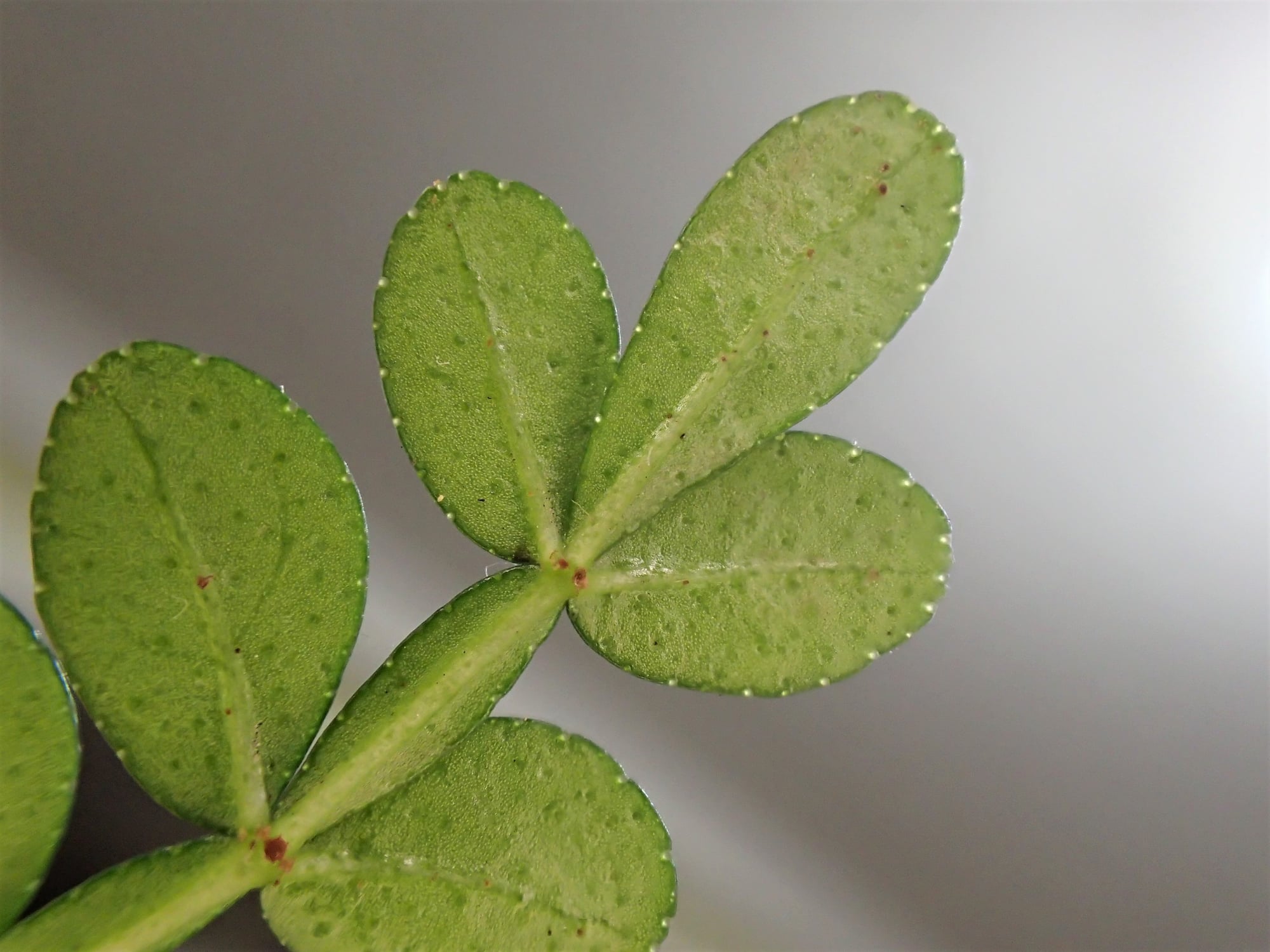 葉片革質、顏色深綠富有光澤 。葉面、葉背有一個個的小點是腺點-是味道的來源,葉背有刺、葉軸中間有翼。