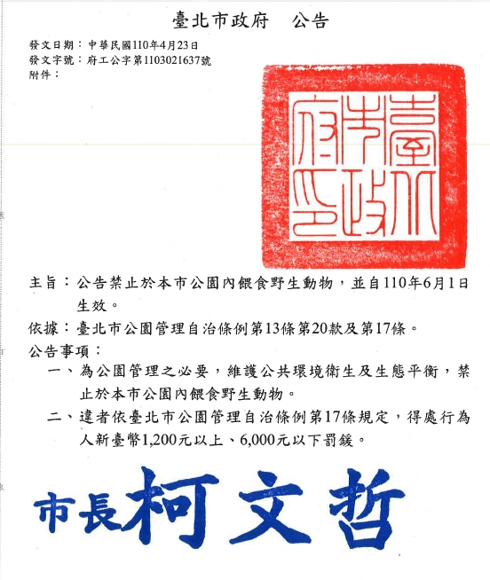 年前曾在臉書上呼籲,為了野生動物健康安全及公園環境衛生,請大家不要餵食禽鳥(野生動物),得到大家的熱情回應與支持,但也遭人(一個?)質疑,「是不是基金會不喜歡的事情,大家就不能做?」在此特別申明,這是政府法令規範、正確恰當的行為,無關乎基金會喜不喜歡。基金會只是公園的認養單位,沒有公權力,甚至連立告示牌寫些「違者嚴懲」、「依法送辦」之類的警示語都不能。我們無法禁止,只能拜託大家發揮影響力,讓正確的觀念帶動良好的行為。